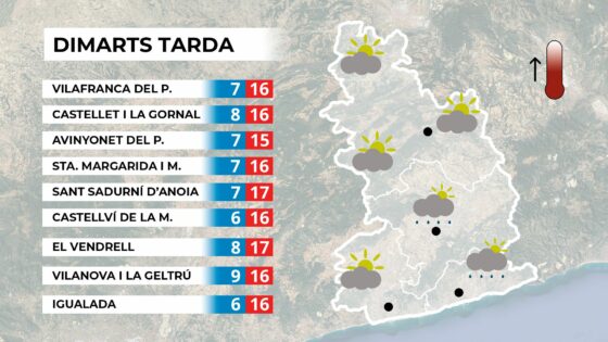 De cara a dimarts, la situació serà molt similar: matí amb estones de sol i núvols, i a la tarda, possibilitat de ruixats i tempestes especialment al litoral i prelitoral central.
