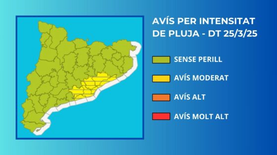 El Servei Meteorològic de Catalunya ha emès un avís moderat per possibles pluges intenses a la comarca, amb acumulacions superiors als 20 litres per metre quadrat en menys de mitja hora.